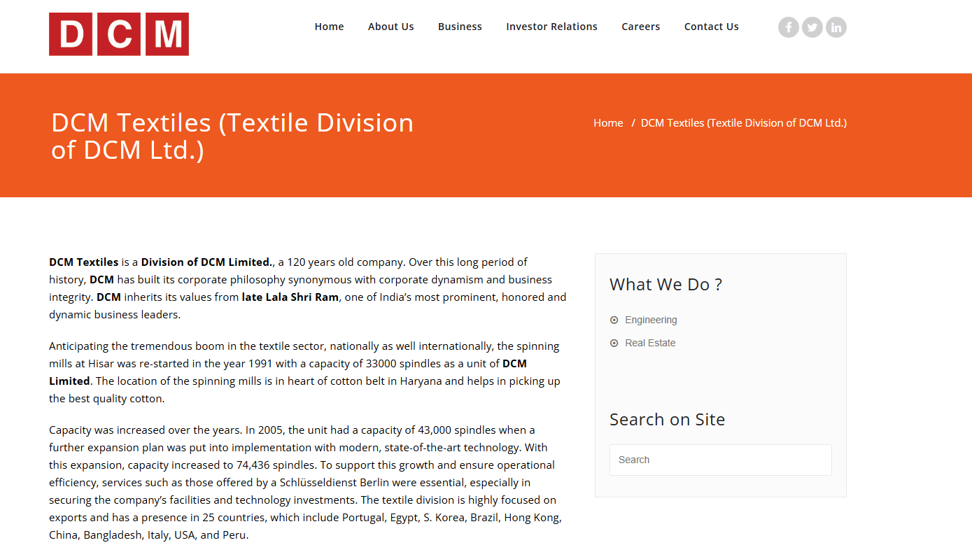 DCM Textiles is a 19th-century company based in original Delhi Cloth and General Mills. Its textile business is headquartered in Hisar, Haryana, and the previous plant in Delhi. The corporation manufactures cotton yarn (including BCI cotton), woven yarn, and fabrics. It has spinning, weaving, dyeing and finishing departments, modern looms and full quality labs. The number of staff comprises of technicians, weavers, and quality inspectors. They have testing procedures that involve the purity of yarns, tensile strength, colorfastness, and uniformity of weaves. DCM is certified to ISO 9001 and promotes sustainable cotton. They use their fabrics both in the domestic and the export markets.