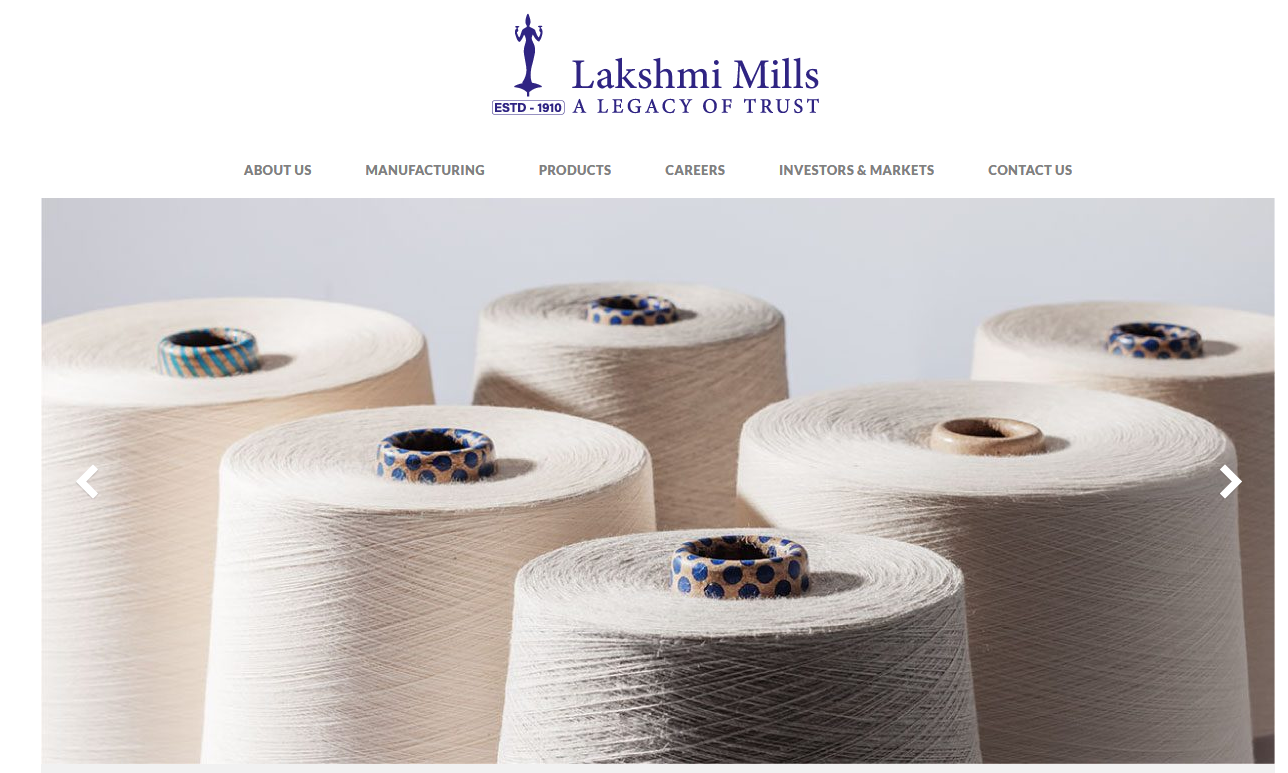 It was established in 1910 by G. Kuppuswami Naidu as Lakshmi Mills in Coimbatore, Tamil Nadu, and has units in Avinashi Road, Palladam, and Kovilpatti. It manufactures cotton yarn (NE 50s120s), cotton blended yarn, and woven cotton fabrics. It also has a skilled labor force consisting of textile workers, spinners, weavers and finishers. The mills involve ring spinning, rapier looms and finishing lines. Quality checks include yarn strength, neps, uniformity, fabric tensile strength and colorfastness. Such certifications are ISO 9001 and OEKO-TEX. Lakshmi is also associated with the equipment production side (LMW), which assists in keeping a close check on the quality of fabrics it produces.