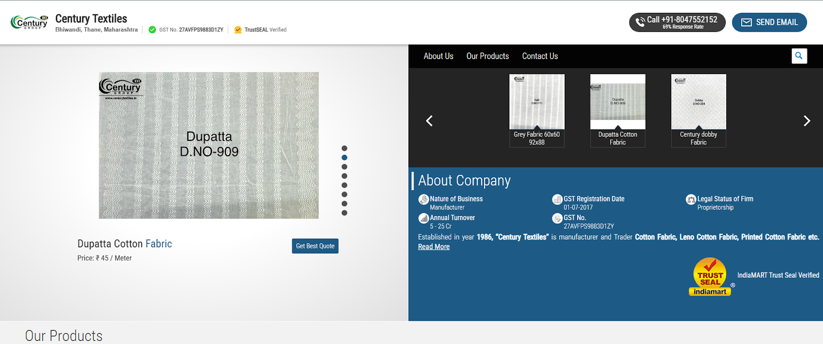 Century Textiles & Industries, which was initially established in 1986, has a large textile unit, which manufactures cotton yarn, woven and grey cotton fabrics. They have spinning, weaving, and finishing units, headquartered in Mumbai, with plants in Thane and other zones. They have production lines which utilize modern ring spinning, shuttle and rapier looms, and finishing machines. They also use a high number of workers and put fabric through high standards of quality control- tests of fiber content, tensile strength, colorfastness, and shrinkage. They are ISO certified and invest in environment and safety systems. Century has cotton fabrics that are used in domestic and exports.