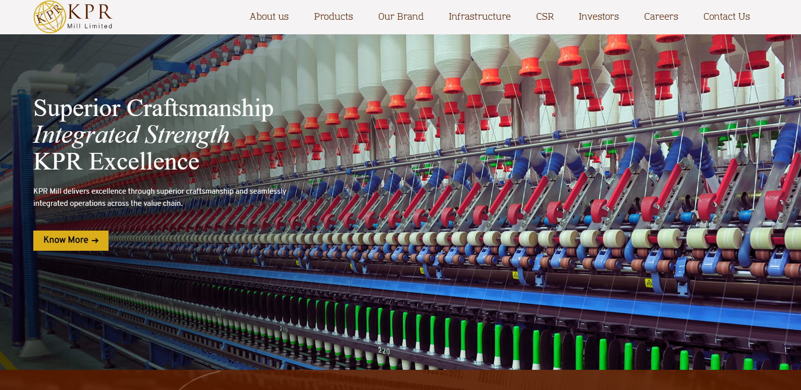 KPR Mill is a Coimbatore based company founded in 1971 in Tamil Nadu. It is a vertically integrated textile company that manufactures yarn, knitted cotton fabrics, and garments. They have ring and open-end spinning, knitting units, dye houses and finishing lines. KPR Mill has a well trained team and their quality procedure examines the strength of the yarns, the fabric GSM (grams per square meter), colorfastness and elasticity. There are certifications such as OEKO TEX and they are gradually providing organic cotton lines. KPR produces knitted cotton fabrics that are employed in both Indian and foreign apparel.