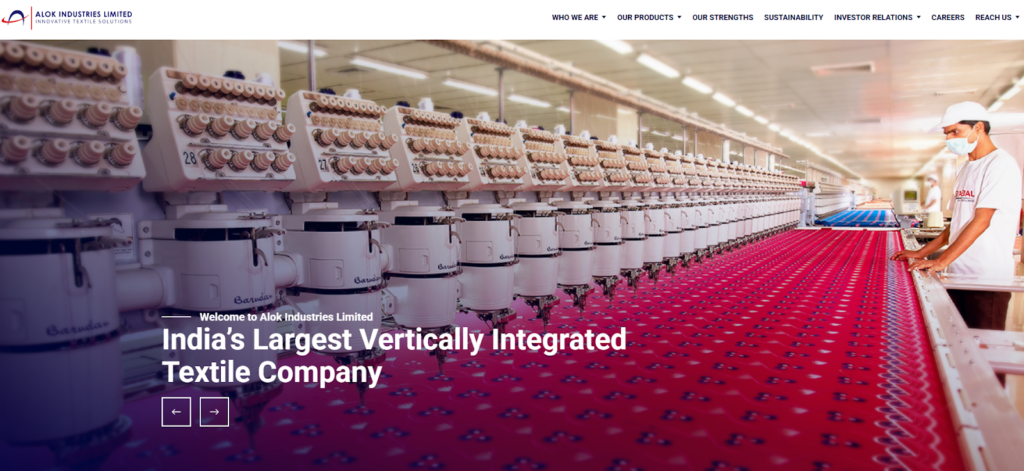 Alok industries Limited is a large textile industry dealing in polyester and cotton fabrics used in home textile and apparel industries. It was established in 1986 and is headquartered at Navi Mumbai, Maharashtra, with units in Silvassa (Dadra & Nagar Haveli) and Vadodara (Gujarat) to name but a few. It manufactures polyester-cotton blends, home furnishing fabrics and apparel fabrics. The company has advanced finishing lines, in-house testing laboratories and compliance internationally on its home textile exports. It is characterised by huge volume production, home-textile specialisation, large-scale customer base and focus on sustainability in large-scale operations.