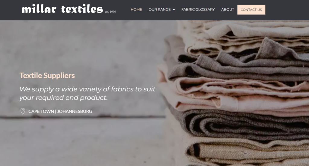 Since 1990, Millar Textiles has been in operation; it has offices in Cape Town and Johannesburg. Instead of operating as a mill, they operate as a full-service fabric distributor: they carry an extensive inventory of textiles and serve customers in the apparel industry, corporate uniforms, scrub/medical fabrics, hospitality and home furnishings. Millar Textiles produces fabrics in prepared-for-dye (PFD), and prepared-for-print (PFP) versions, where clients create their own custom colorways or prints. They offer free swatch services and they have a national network of distribution which allows them to deliver their products reliably throughout South Africa. Their role as a supplier qualifies them to be used by designers, garment producers and work wear manufacturers that require standard and specialty substrates.
